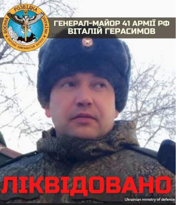Σύμφωνα με ανακοίνωση του ουκρανικού υπ. Άμυνας νεκρός είναι ο Βιτάλι Γερασίμοφ, υποδιοικητής της 41ης στρατιάς της Κεντρικής Περιοχής της Ρωσίας.