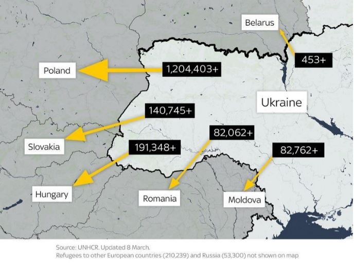 Η πολωνική συνοριοφυλακή ανακοίνωσε ότι από τις 24 Φεβρουαρίου έως και σήμερα περίπου 1,2 εκατομμύρια Ουκρανοί άνθρωποι έχουν εισέλθει στη χώρα. Μόνο τη Δευτέρα ο αριθμός των Ουκρανών που πέρασαν στην Πολωνία ήταν 141.500