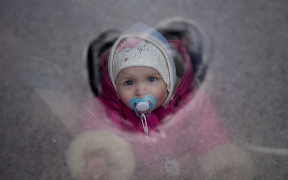 - 19:33Ένα μωρό από την Ουκρανία φαίνεται μέσα από το παράθυρο του πούλμαν που πέρασε τα σύνορα προς την Πολωνία