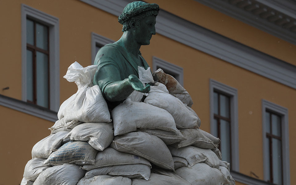 - 19:28Το μνημείο του ιδρυτή της Οδησσού Δούκα ντε Ρισελιέ καλυμμένο με σάκους άμμου για προστασία εν μέσω της Ρωσικής εισβολής
