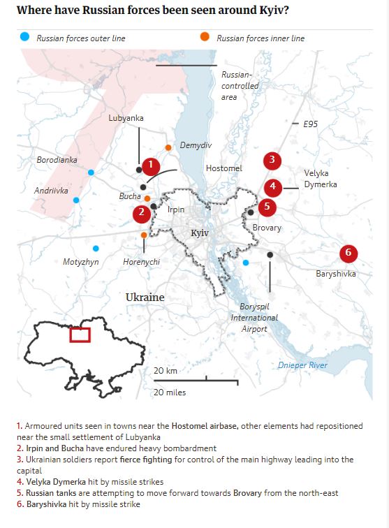 Σύμφωνα με το βρετανικό υπουργείο Άμυνας, οι μάχες βορειοδυτικά του Κιέβου συνεχίζονται, με τις ρωσικές δυνάμεις να υπολογίζεται ότι βρίσκονται περίπου 25 χμλ. μακριά από το κέντρο της πρωτεύουσας.