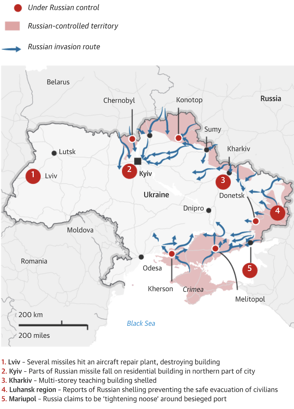 Η Ρωσία εισέβαλε στην Ουκρανία την 24η Φεβρουαρίου. Ο επικεφαλής των ανθρωπιστικών υπηρεσιών στην ουκρανική πρωτεύουσα Ολεξίι Κουλέμπα δήλωσε νωρίς σήμερα ότι τουλάχιστον 50.000 άμαχοι έχουν απομακρυνθεί από τα σημεία των συγκρούσεων στα βόρεια και τα βορειοδυτικά του Κιέβου και οι αρχές συνεχίζουν τις προσπάθειες διάσωσης από τις πλέον ευάλωτες περιοχές.
