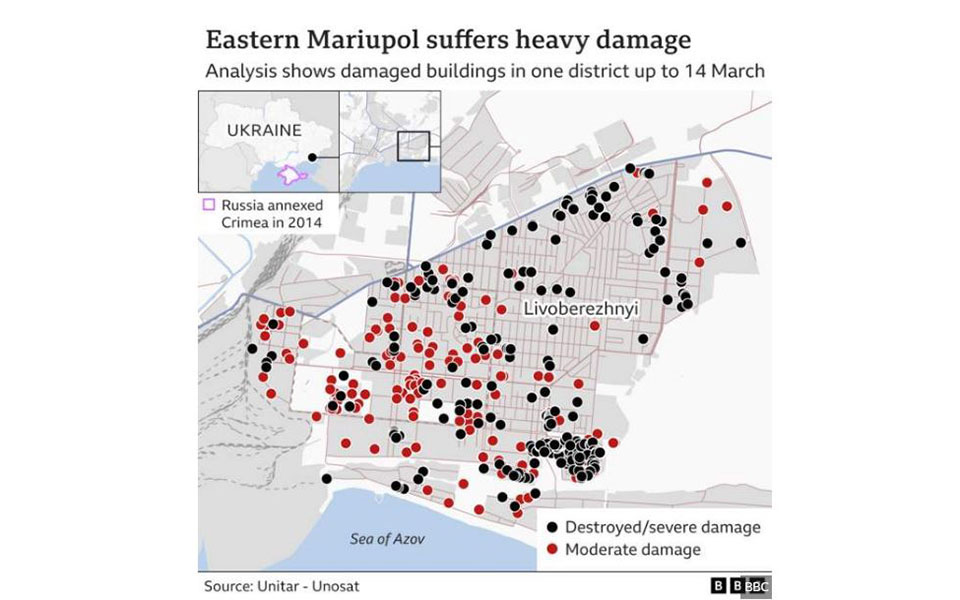 Γράφημα του ΒΒC εμφανίζει τα βομβαρδισμένα σημεία της Μαριούπολης. Πρόκειται μόνο για τις ανατολικές περιοχές της πολιορκούμενης πόλης...
