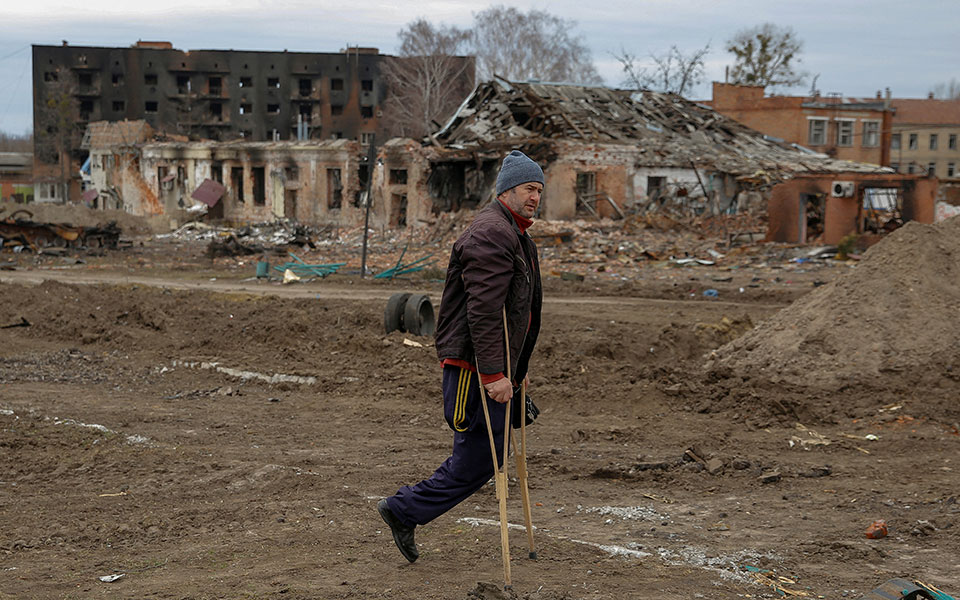 - 22:17Ένας κάτοικος περπατά δίπλα σε κτίρια που έχουν υποστεί ζημιές από βομβαρδισμούς στο Τρόστιανετς