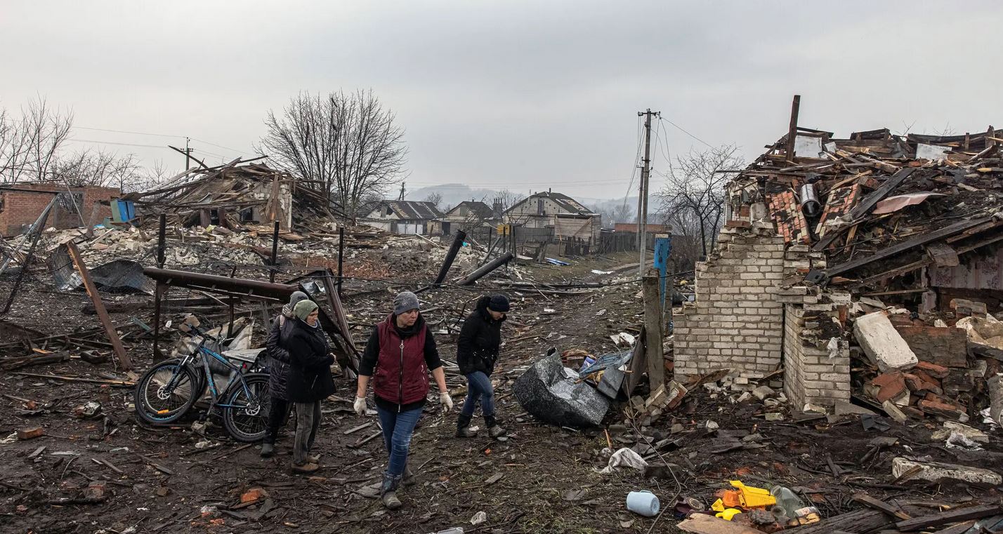 - 16:00Κάτοικοι περπατούν μπροστά από κατεστραμμένα κτίρια σε ένα χωριό κοντά στο Τρόστιανετς