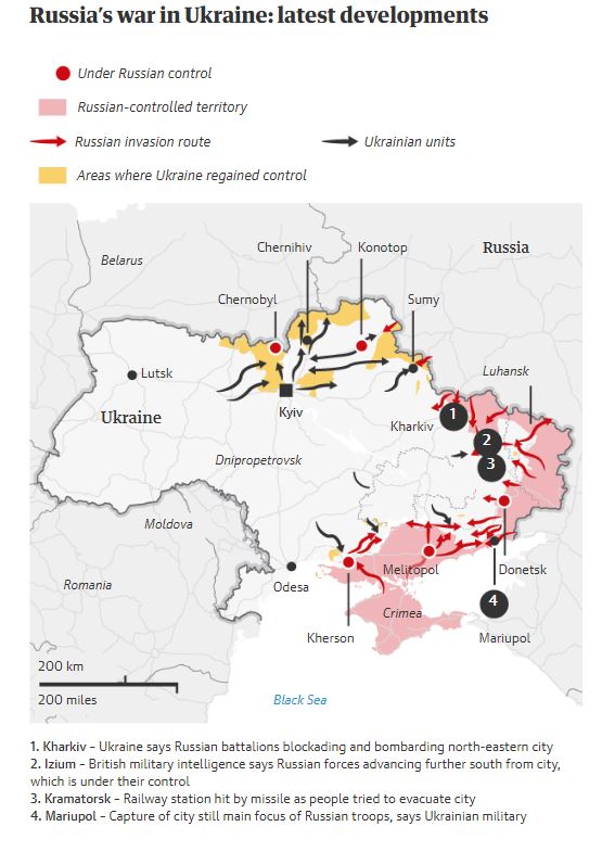 Στον χάρτη που παραθέτει ο Guardian αποτυπώνεται η κινητικότητα των ρωσικών δυνάμεων (κόκκινο και ροζ χρώμα) στα ανατολικά και νότια, όπου, όπως υποστηρίζουν οι βρετανικές και αμερικανικές υπηρεσίες, καταγράφεται συσσώρευση στρατευμάτων και αναμένεται να κλιμακωθούν οι επιθέσεις.