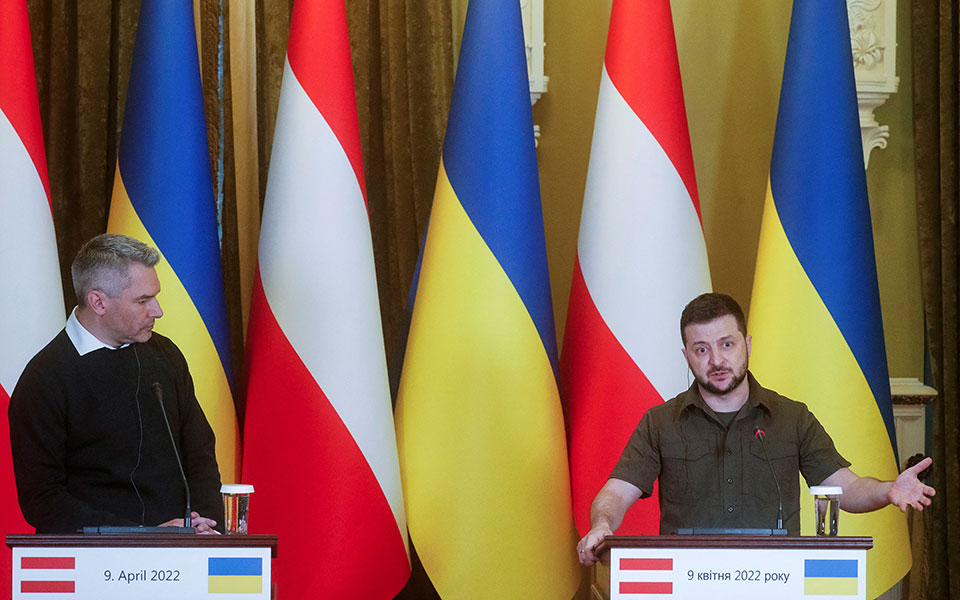 «Η Ουκρανία έλεγε πάντα πως είναι έτοιμη για διαπραγματεύσεις και πως αναζητεί κάθε πιθανότητα για να σταματήσει ο πόλεμος. Παράλληλα βλέπουμε δυστυχώς ετοιμασίες για σημαντικές μάχες, ορισμένοι λένε αποφασιστικής σημασίας, στα ανατολικά», δήλωσε ο Ζελένσκι σε συνέντευξη Τύπου με τον Αυστριακό καγκελάριο Καρλ Νεχάμερ. Ο τελευταίος επισκέπτεται το Κίεβο και την Μπούκα, κοντά στην ουκρανική πρωτεύουσα, που έγινε ένα σύμβολο των θηριωδιών της ρωσικής εισβολής.