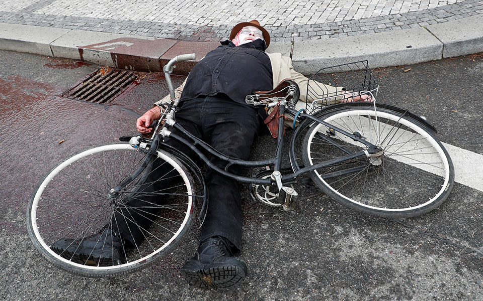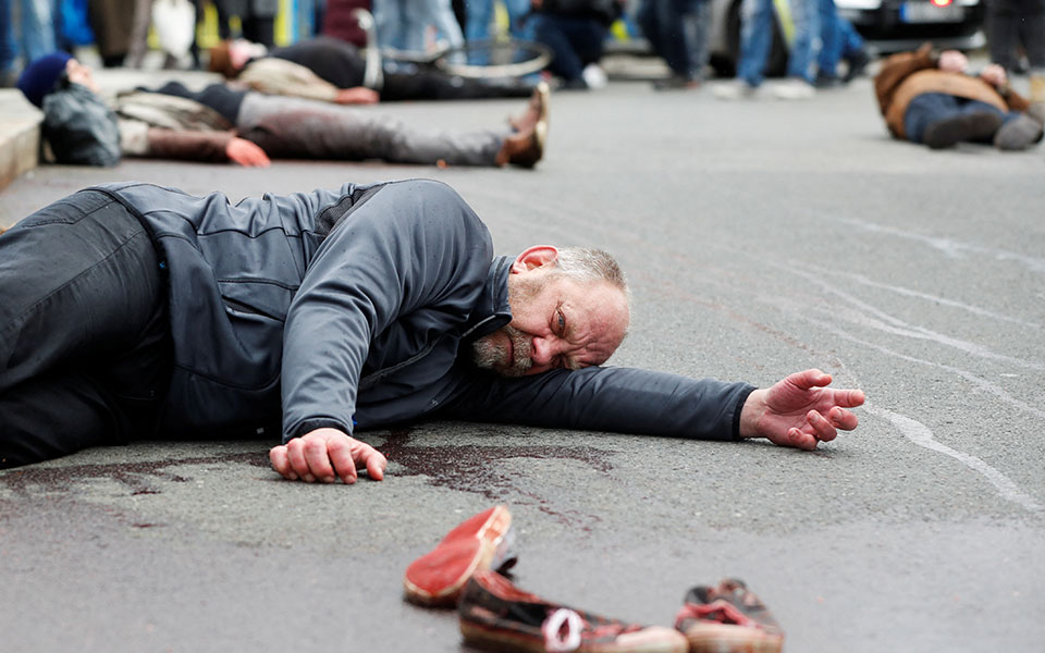 - 15:44Αναπαριστώντας τους νεκρούς αμάχους στην πόλη Μπούκα, πολίτες διαμαρτυρήθηκαν έξω από την ρωσική πρεσβεία στην Πράγα.