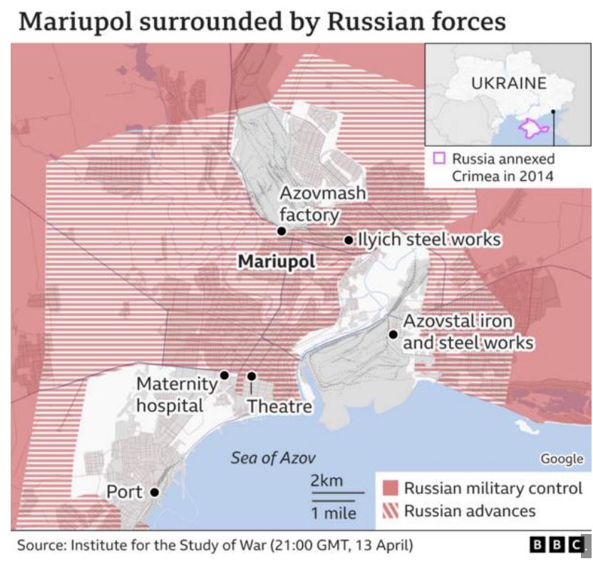 - Οι ουκρανικές δυνάμεις εξακολουθούν να υπερασπίζονται τη Μαριούπολη, ισχυρίστηκε ο Ουκρανός πρωθυπουργός Ντένις Σμίχαλ, τονίζοντας ότι η πόλη «δεν έχει πέσει». Βρετανικές πληροφορίες επιβεβαιώνουν ότι το Σύνταγμα Αζόφ αντέχει ακόμη στη χαλυβουργία Άζοφσταλ, όπου υπάρχουν και εκατοντάδες άμαχοι πολίτες.