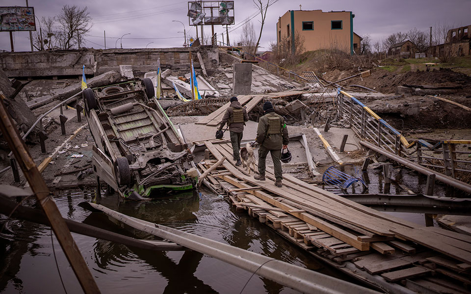 - 16:57Ουκρανοί στρατιώτες περπατούν σε μια κατεστραμμένη γέφυρα στο Ιρπίν, στα περίχωρα του Κιέβου