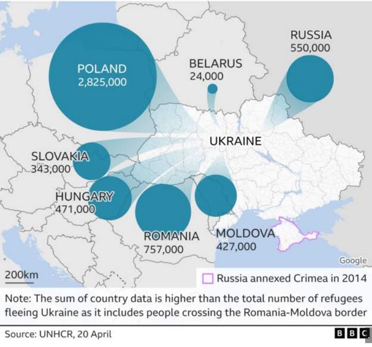 Η Ύπατη Αρμοστεία των Ηνωμένων Εθνών για τους Πρόσφυγες (UNHCR) ανακοίνωσε πως 5 εκατομμύρια άνθρωποι αναγκάστηκαν να εγκαταλείψουν την Ουκρανία μετά τη στρατιωτική εισβολή της Ρωσίας στη γειτονική της χώρα την 24η Φεβρουαρίου.