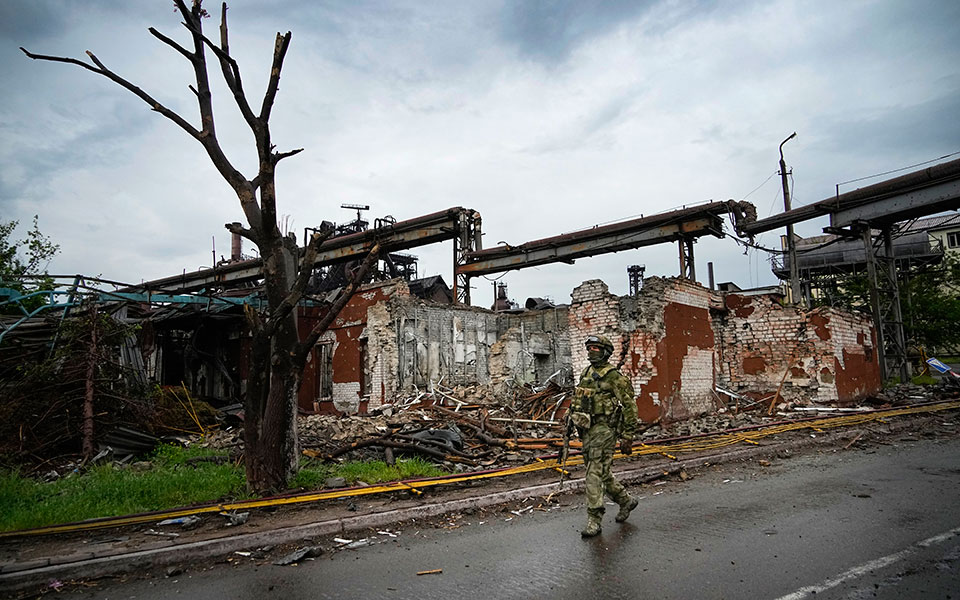 Ένας Ρώσος στρατιώτης σε περιπολία δίπλα σε ένα κατεστραμμένο τμήμα του μεταλλουργικού εργοστασίου Illich Iron & Steel Works στη Μαριούπολη