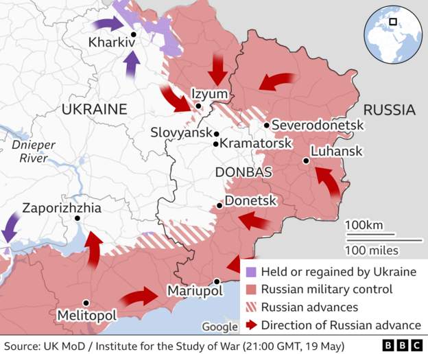 Την ώρα όπου οικογένειες που είχαν διαφύγει από το Κίεβο και το Χάρκοβο επιστρέφουν σιγά σιγά στις εστίες τους, καθώς αισθάνονται πιο ασφαλείς, και η Μαριούπολη μπήκε πλέον σε καθεστώς πλήρους ρωσικής κατοχής, οι μάχες πλέον επικεντρώνονται στις περιοχές περί τον ποταμό Σεβέρσκι Ντόνετς, στο Ντονμπάς, με πολύ σκληρές συγκρούσεις και εκατέρωθεν βομβαρδισμούς.