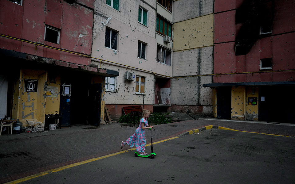 - 13:52Ένα κορίτσι κοντά σε κτίρια που έχουν υποστεί καταστροφές στο Ιρπίν, προάστιο του Κιέβου. AP Photo.