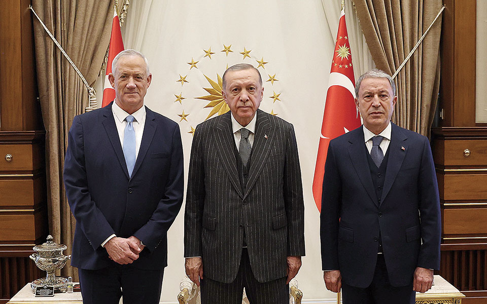 AΓΚΥΡΑ. Επανεκκίνηση των σχέσεων Ισραήλ – Τουρκίας στον τομέα της άμυνας συνιστά η επίσκεψη του υπουργού Αμυνας του Ισραήλ Μπένι Γκαντζ χθες στην Αγκυρα και η συνάντησή του με τον Τούρκο πρόεδρο Ταγίπ Ερντογάν. Η πρώτη τέτοιου είδους επίσκεψη έπειτα από «κενό» δέκα χρόνων προσέθεσε ένα ακόμη κομμάτι στο παζλ της προσέγγισης των δύο χωρών, που φιλοτεχνείται μετά την αποχώρηση του Μπέντζαμιν Νετανιάχου από την πρωθυπουργία του Ισραήλ.