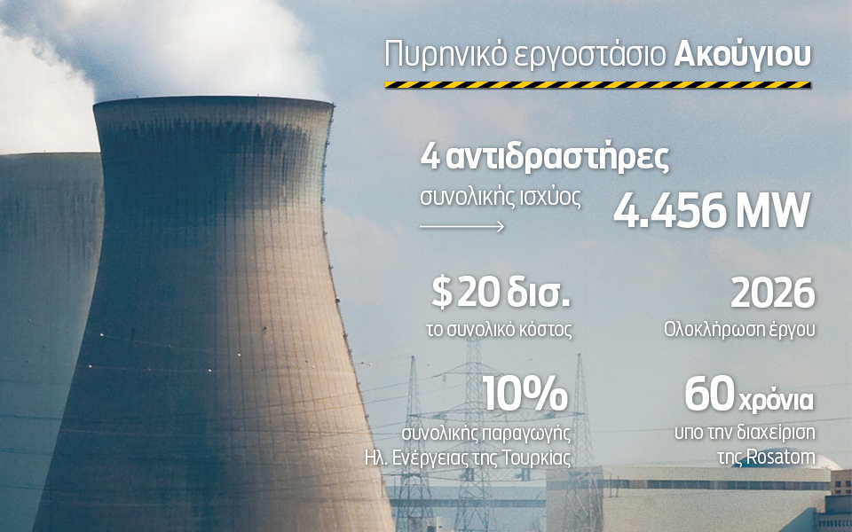 Ηταν Μάιος του 2010. Βλαντιμίρ Πούτιν και Ρετζέπ Ταγίπ Ερντογάν υπογράφουν συμφωνία για την κατασκευή πυρηνικού εργοστασίου στο Ακούγιου, στο Μπουγιουκετσελί, στην επαρχία της Μερσίνας, βόρεια της Κύπρου, που θα περιλαμβάνει τέσσερις πυρηνικούς αντιδραστήρες συνολικής ισχύος 4.456 Megawatt, με προϋπολογισμό που φτάνει τα 20 δισ. δολάρια.