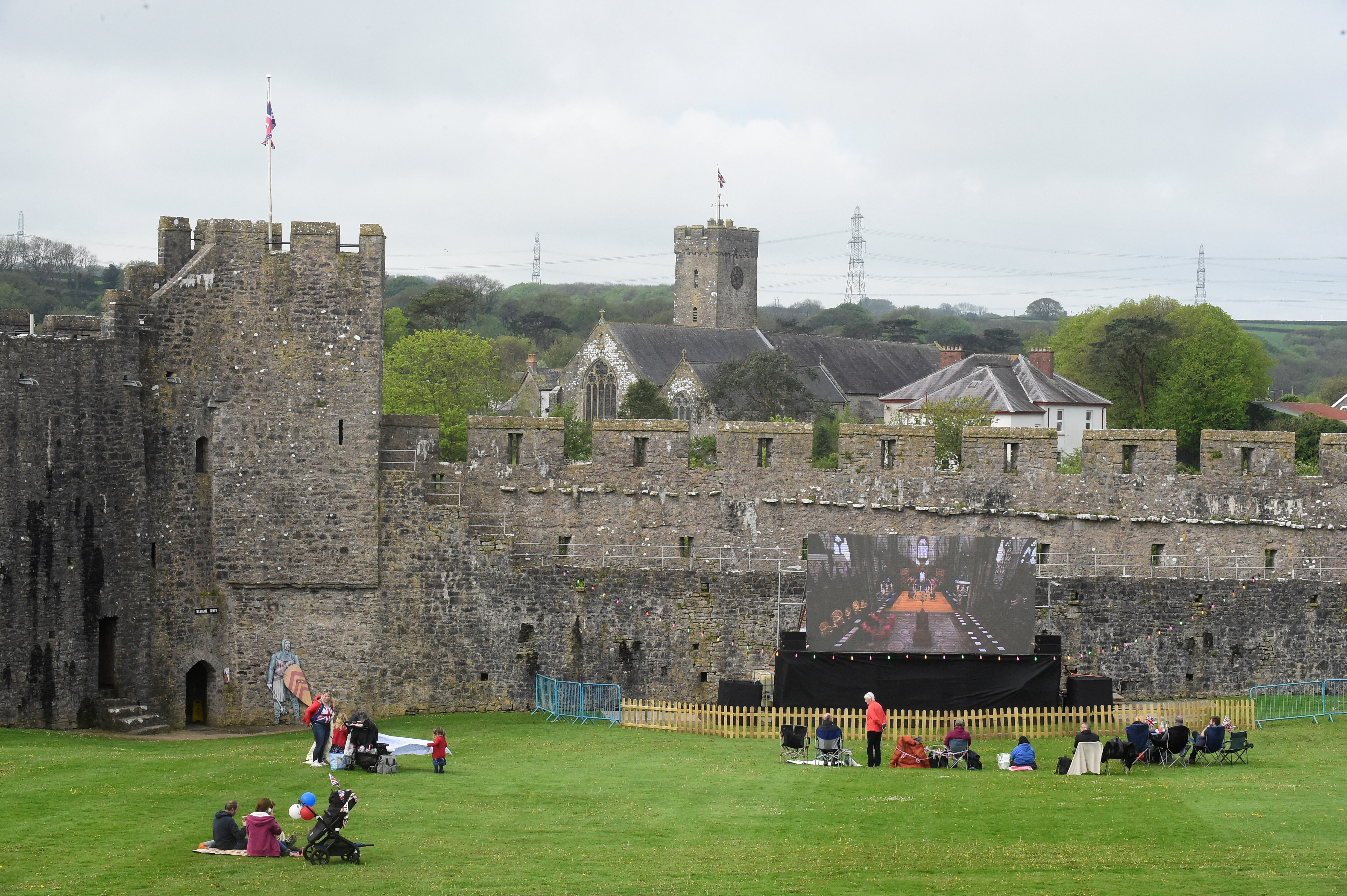 Μεγάλη οθόνη για τη στέψη στο Κάστρο Πεμπρόουκ, στην Ουαλία, Βρετανία.