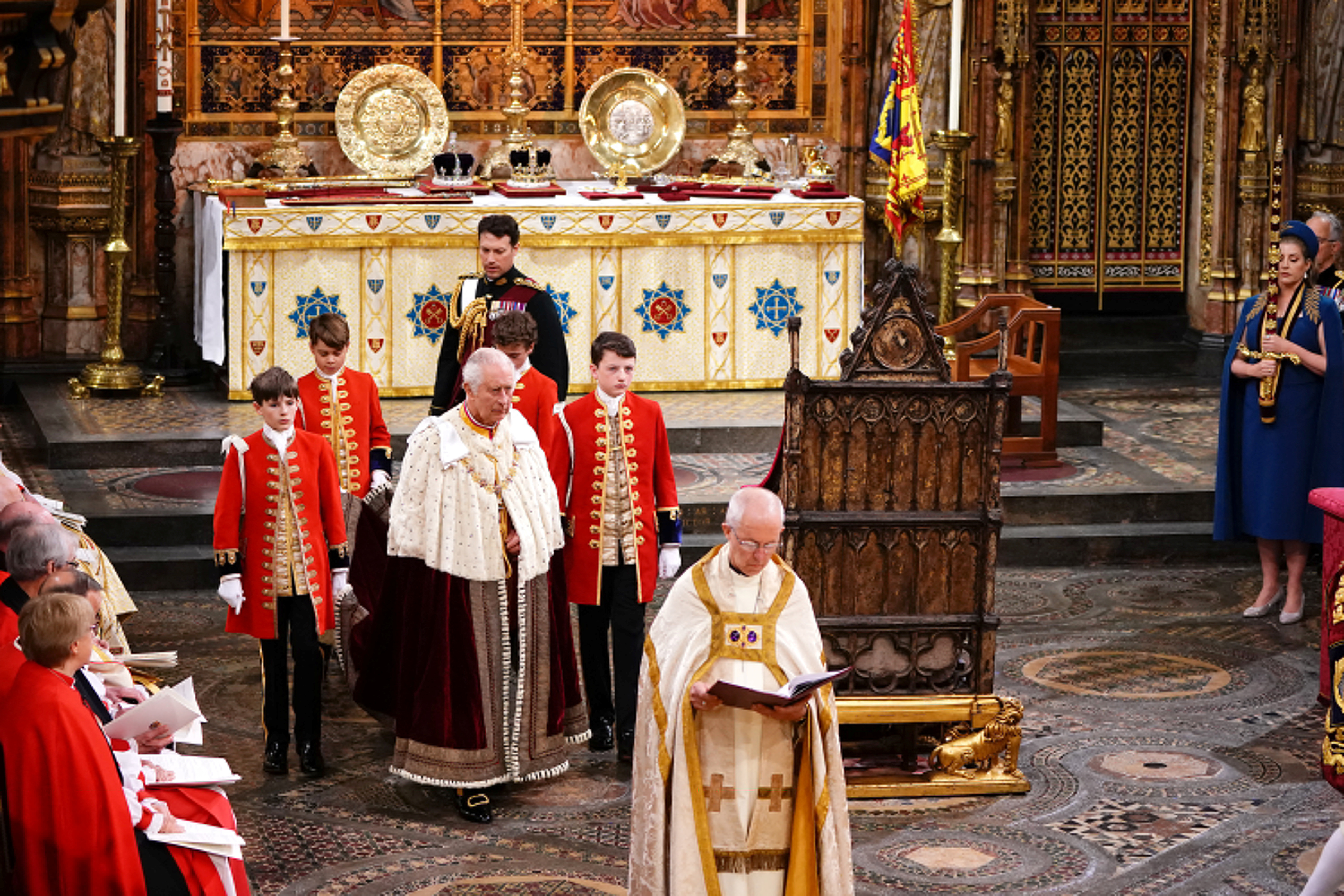 Η αλλαγή του ενδύματος γίνεται μέσα σε ένα εντυπωσιακό παραβάν, ενώ ψαλμωδίες που υμνούν τον νέο βασιλιά κατακλύζουν το Αβαείο του Ουέστμινστερ.