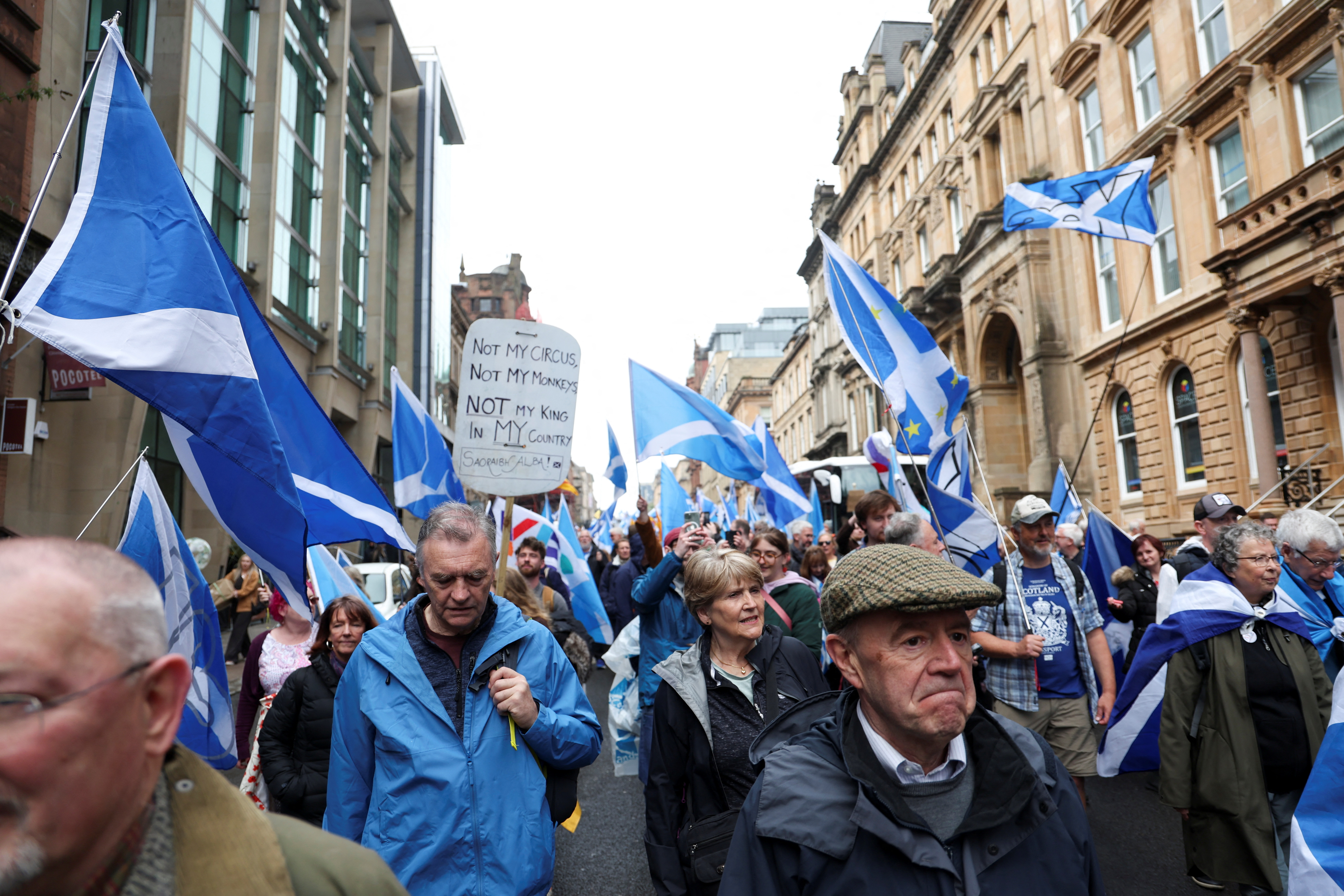 Πολίτες συμμετέχουν σε πορεία για την ανεξαρτησία της Σκωτίας, στη Γλασκώβη, ταυτόχρονα με τη στέψη του βασιλιά Καρόλου και της βασιλικής συζύγου Καμίλα.