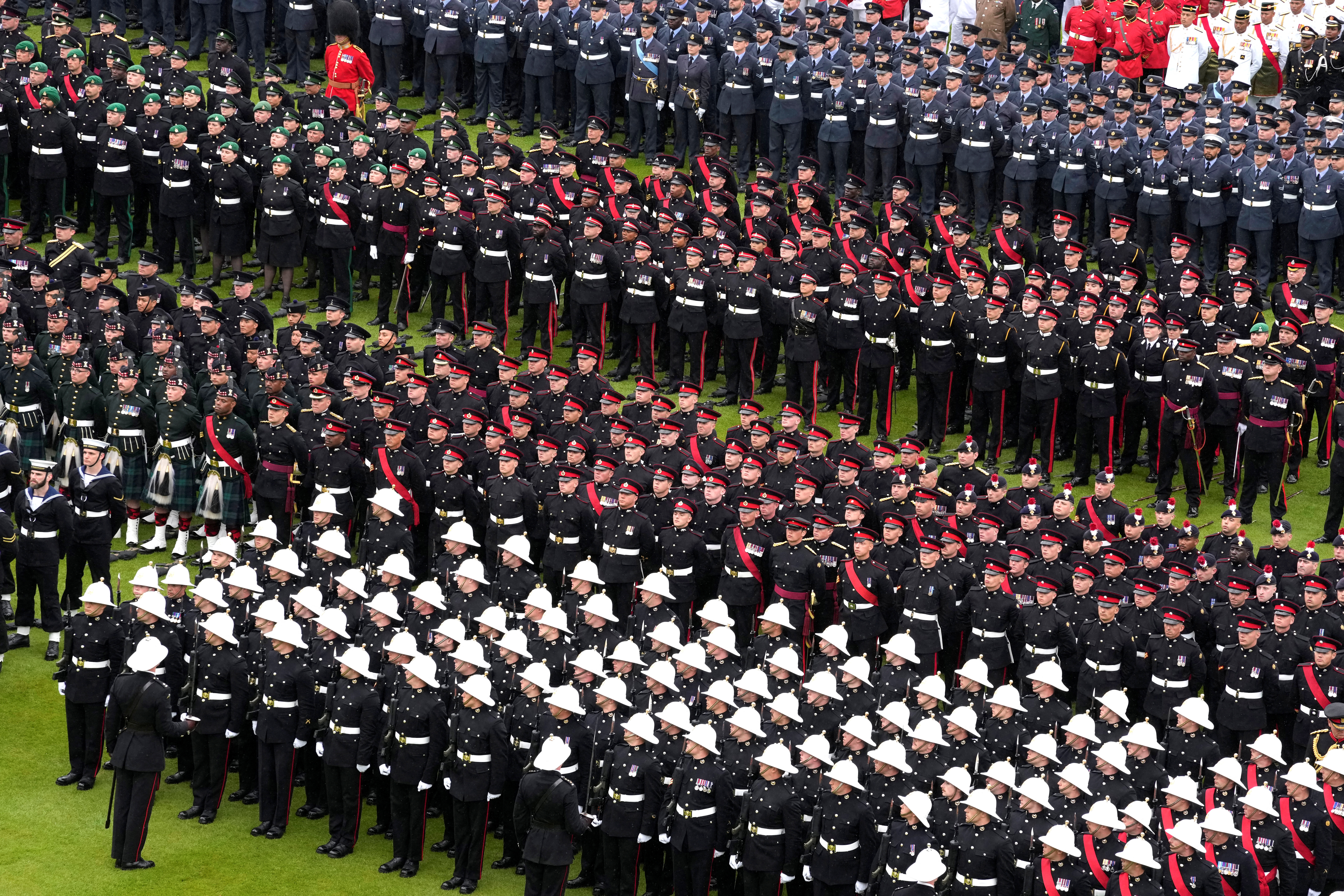Το βασιλικό ζεύγος συνοδεύουν αγήματα από τις χώρες της Κοινοπολιτείας, όπου ο Κάρολος είναι αρχηγός του κράτους.