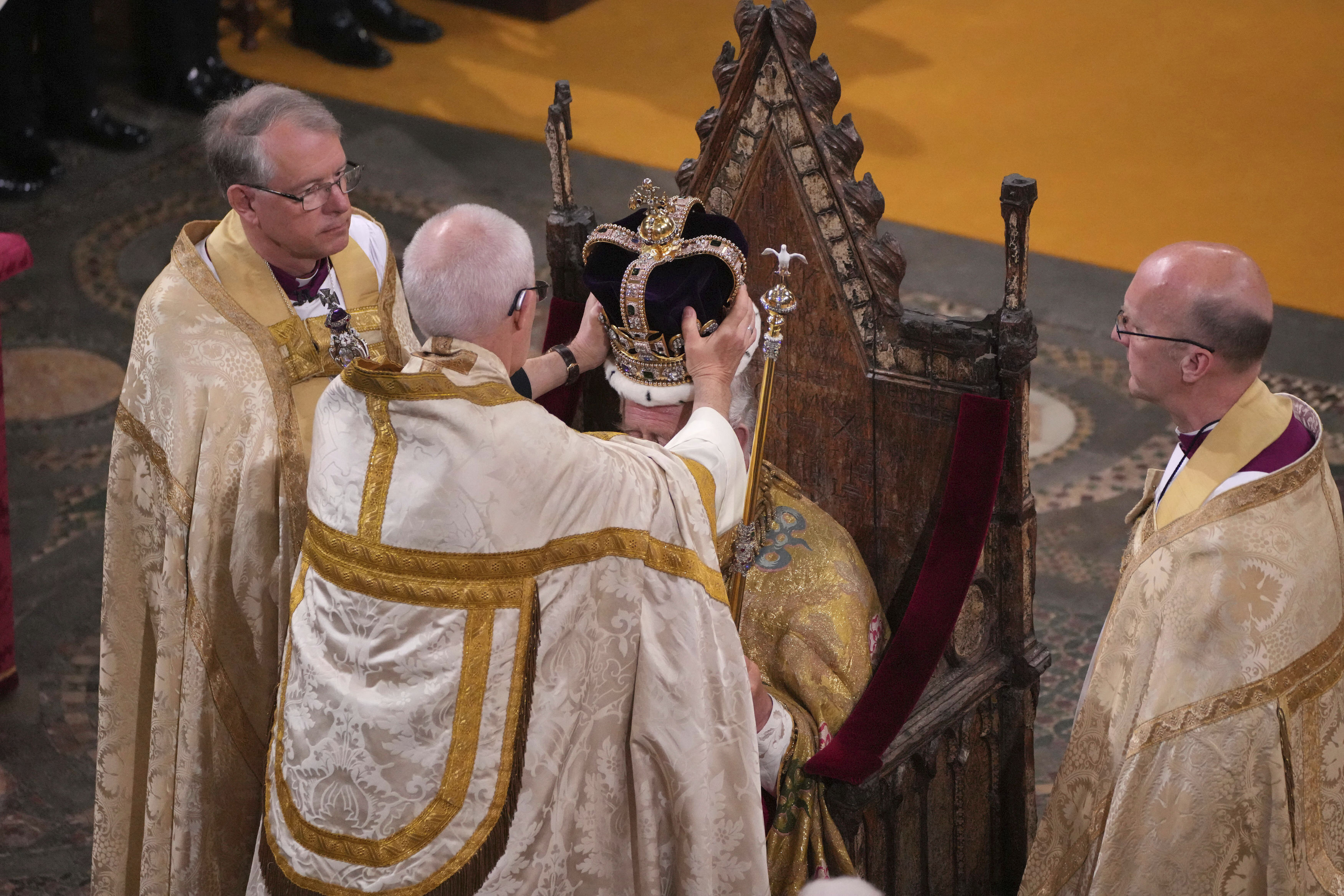 - 15:05???????????? ???????????????????????????????? ???????? ???????????? ????????????????The Archbishop of Canterbury places St Edward’s Crown on The King’s anointed head. The clergy, congregation and choir all cry ‘God Save The King’.#Coronation pic.twitter.com/kGrV3W0bky