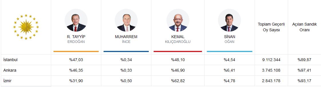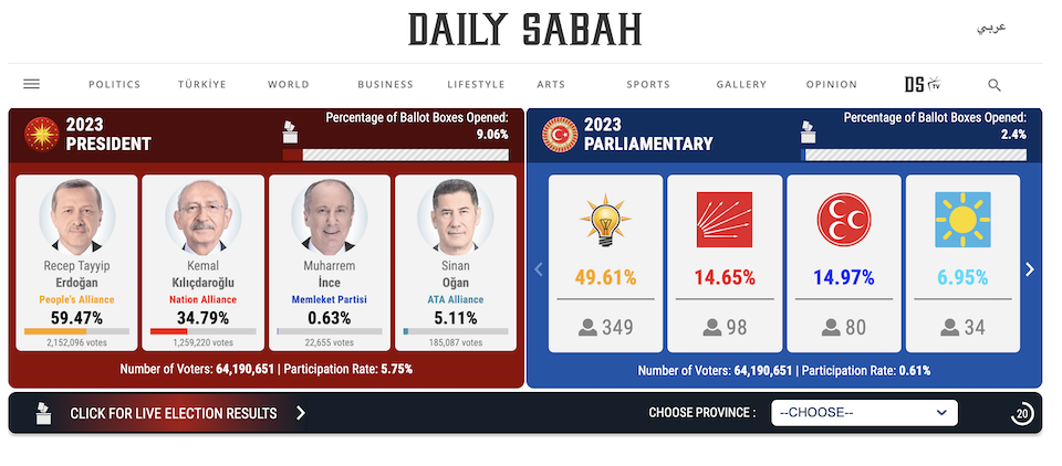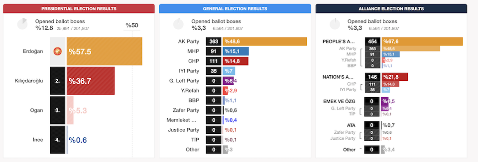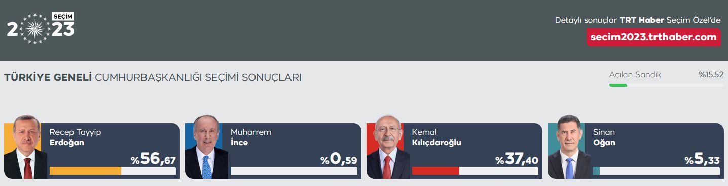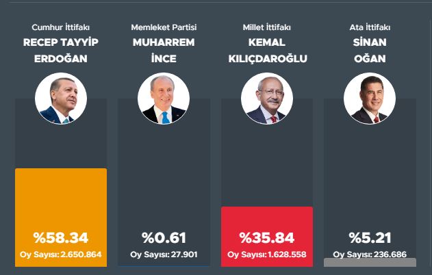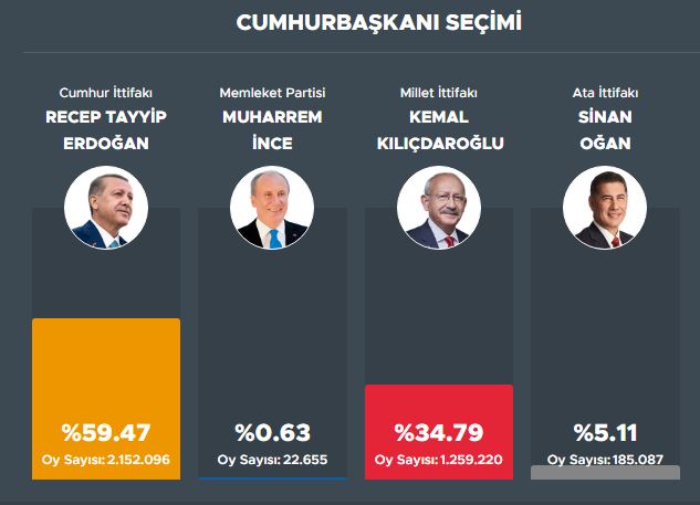Ο Πρόεδρος του Ανώτατου Συμβουλίου Ραδιοφωνίας και Τηλεόρασης, Εμπουμπεκίρ Σαχίν, ανέφερε σε ανάρτησή του στο Twitter: «Σύμφωνα με τις αποφάσεις της YSK, είναι εντός του πεδίου των εκλογικών απαγορεύσεων να δίνονται τα αποτελέσματα των εκλογών πριν από τις 21:00. Είναι νομική αναγκαιότητα».