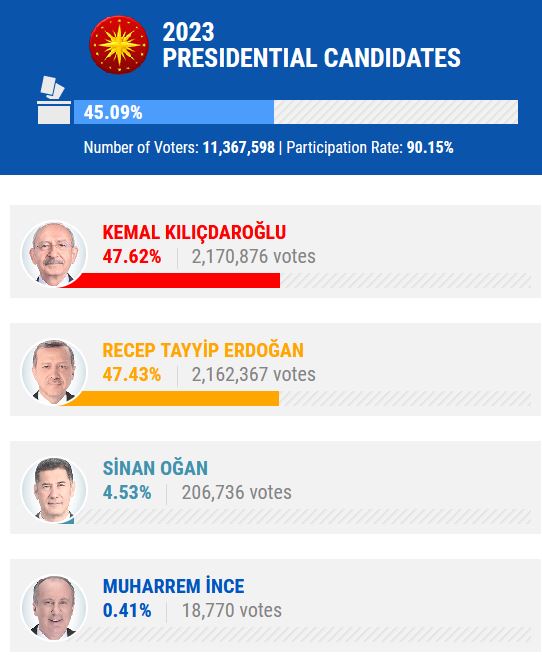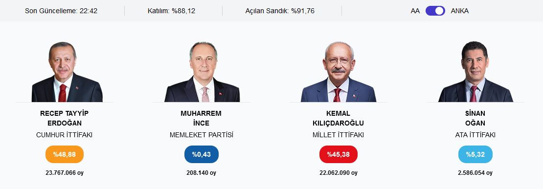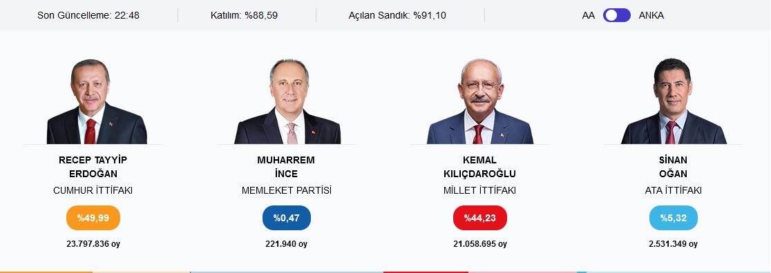 - 23:46Κάτω από το 50% το ποσοστό Ερντογάν με πάνω από το 90% των ψήφων καταμετρημένο