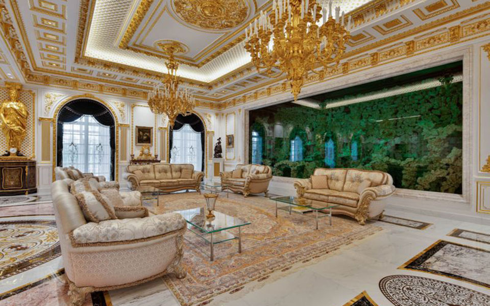 Το αρχοντικό που θυμίζει Βερσαλλίες έχει ένα παράδοξο: Ενώ αποτελείται από 5.600 τετραγωνικά μέτρα εσωτερικού χώρου, διαθέτει μόνο πέντε υπνοδωμάτια.
