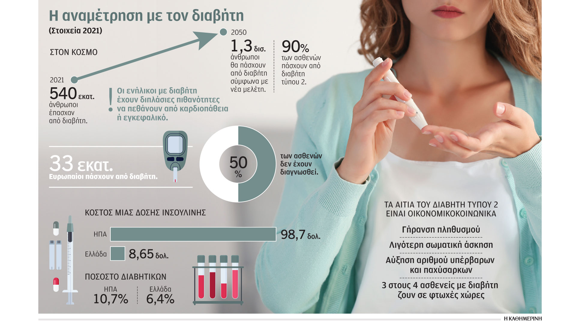 ΛΟΝΔΙΝΟ. Να διπλασιασθεί αναμένεται ο αριθμός των ασθενών με διαβήτη σε όλο τον κόσμο μέχρι το 2050, σύμφωνα με νέα ιατρική μελέτη, η οποία αποδίδει την ανησυχητική τάση στην αύξηση του αριθμού παχύσαρκων και στη διεύρυνση των υγειονομικών ανισοτήτων.