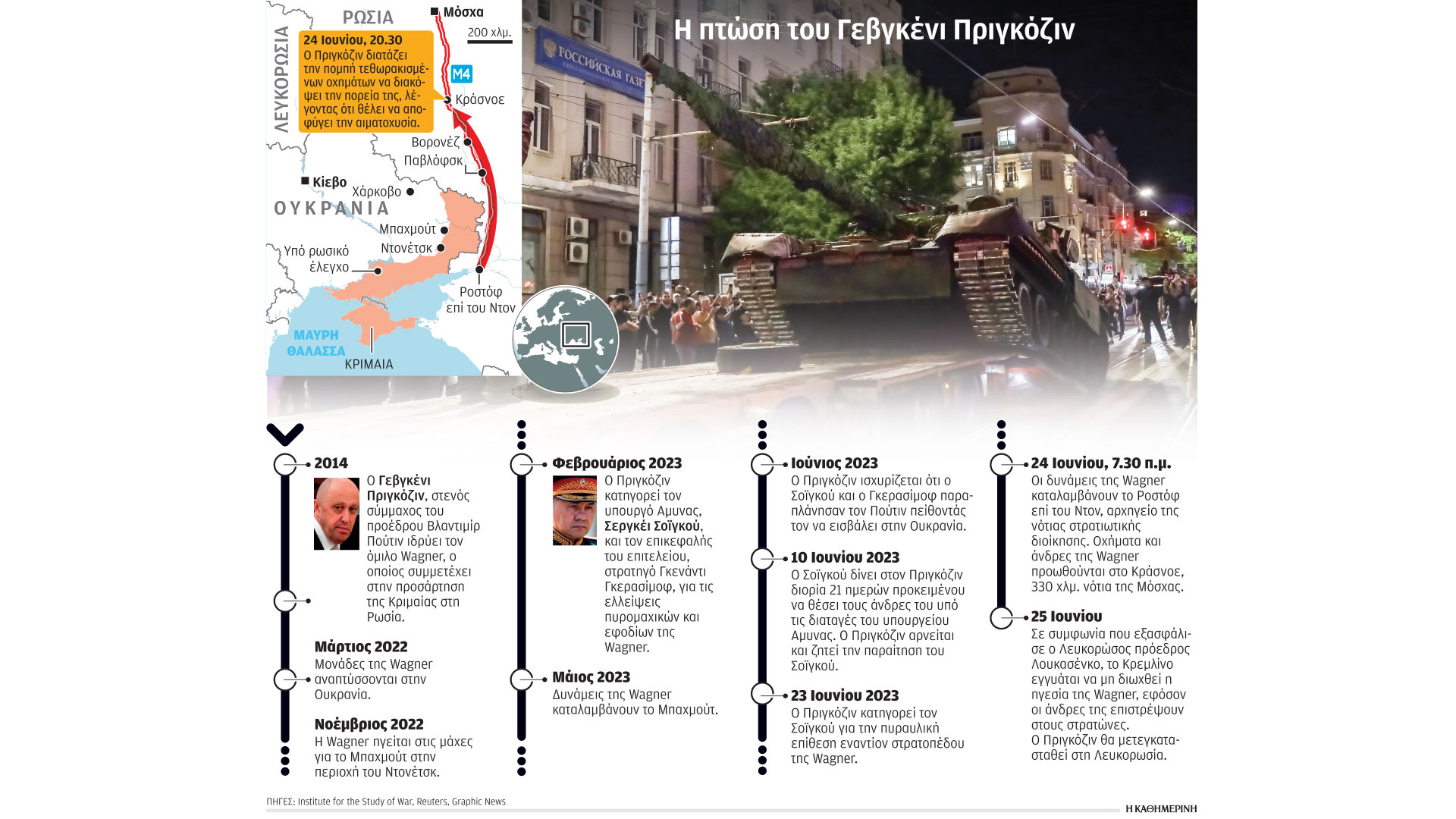 Οι δύο πρωταγωνιστές της κρίσης έκαναν χθες τις πρώτες εμφανίσεις τους ύστερα από το δραματικό εικοσιτετράωρο που έφερε στρατεύματα της Wagner 200 χιλιόμετρα έξω από τη Μόσχα. Σε χθεσινοβραδινό διάγγελμά του προς το έθνος, ένας εμφανώς οργισμένος Πούτιν στιγμάτισε την ανταρσία χωρίς να αναφερθεί ονομαστικά στον Πριγκόζιν και δήλωσε ότι είχε πάρει μέτρα ώστε να συντριβούν οι στασιαστές. Ευχαρίστησε τους διοικητές και τους μαχητές της Wagner που απέτρεψαν την αιματοχυσία και δήλωσε ότι είναι ελεύθεροι να επιλέξουν αν θέλουν να υπογράψουν νέες συμβάσεις με το υπουργείο Αμυνας, να επιστρέψουν στις οικογένειές τους ή να καταφύγουν στη Λευκορωσία. Αργά το βράδυ ανακοινώθηκε ότι ο Πούτιν είχε σύσκεψη με τους επικεφαλής των υπηρεσιών ασφαλείας, παρόντος και του υπουργού Αμυνας Σεργκέι Σοϊγκού.