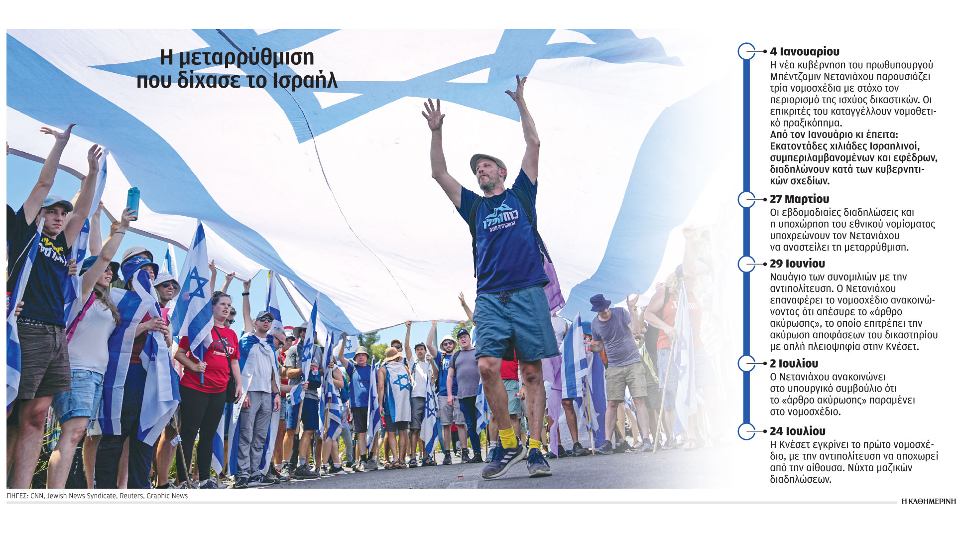 Τις απειλές των διαδηλωτών, της αντιπολίτευσης και των συνδικάτων για αγώνα διαρκείας κατά του νομοσχεδίου αγνόησαν οι βουλευτές του κυβερνητικού συνασπισμού, ψηφίζοντας χθες το νομοθέτημα. Η απόφαση του πρωθυπουργού να προωθήσει την αμφιλεγόμενη μεταρρύθμιση μπορεί να οξύνει περαιτέρω τις σχέσεις με την κυβέρνηση Μπάιντεν και να οδηγήσει σε «κοινωνικό σχίσμα», όπως χαρακτηριστικά προειδοποίησε ο Ισραηλινός πρόεδρος Γιτζάκ Χέρτσογκ.