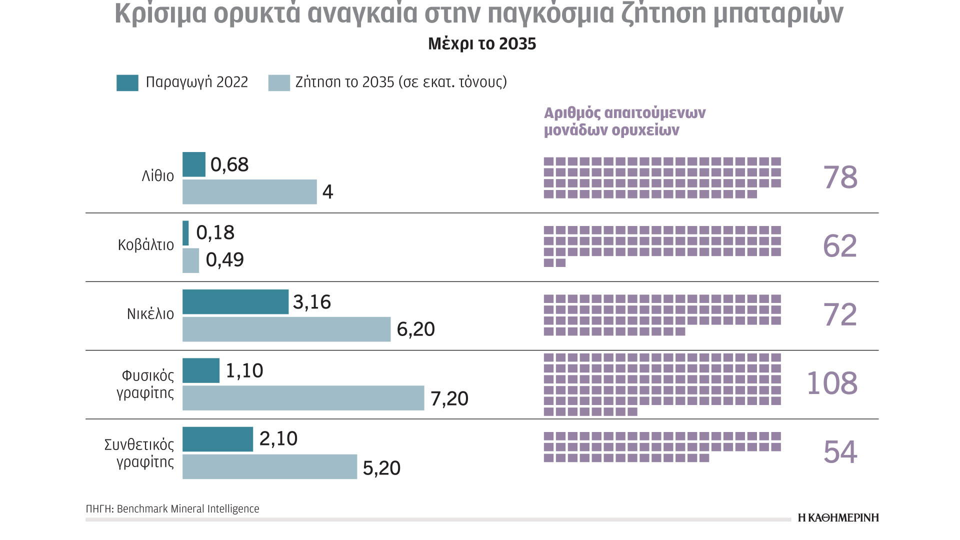 Με την εκτίναξη της χρήσης μπαταριών έως το 2035, εκτοξεύεται και η ζήτηση σε κρίσιμα ορυκτά και πρώτες ύλες. Η ζήτηση σε λίθιο θα αυξηθεί 730%, σε νικέλιο 100%, σε φυσικό γραφίτη 550% και σε συνθετικό γραφίτη 150%. Το πρόβλημα δεν έγκειται μόνο στη μεγάλη ζήτηση και προμήθεια πρώτων υλών, αλλά και στον χρόνο έναρξης λειτουργίας νέων ορυχείων (συχνά άνω της 15ετίας).