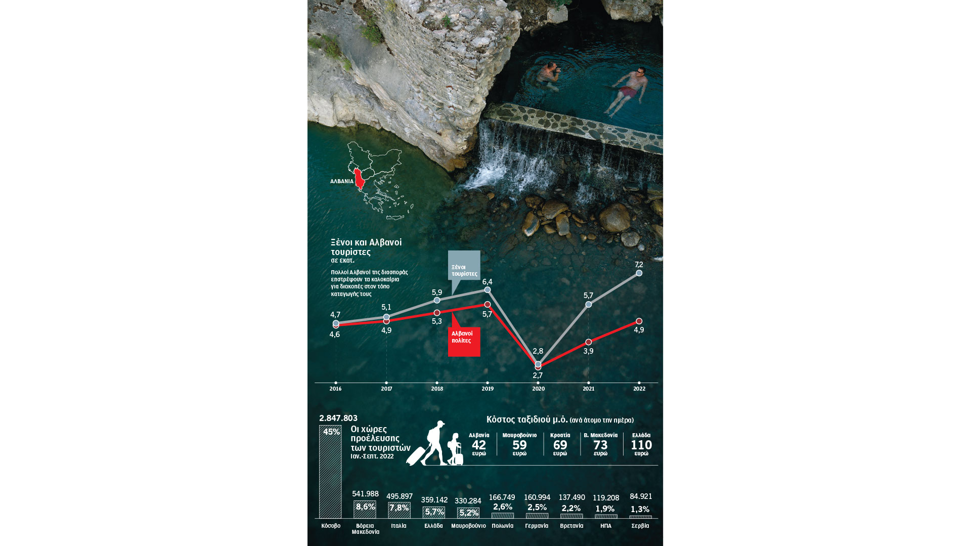 «Από το 2016 μέχρι το 2022 σημειώθηκε αύξηση των αφίξεων 66%», εξηγεί στην «Κ» από το Μάντσεστερ ο Ελιόν Ιωάννης Μυρτολλάρι, αναλυτής δεδομένων που παρακολουθεί την αλματώδη ανάπτυξη του τουρισμού στη χώρα καταγωγής του. «Το 2022 υποδεχθήκαμε πάνω από 7,2 εκατ. τουρίστες, ενώ φέτος ενδέχεται να καταρριφθεί αυτό το ρεκόρ», σημειώνει. Κατά τον κ. Μυρτολλάρι, οι καλύτερες έως τώρα χρονιές ήταν το 2017 και το 2019. Σύμφωνα με το Ινστιτούτο Στατιστικής της Αλβανίας (INSTAT), περίπου 2,4 εκατ. άνθρωποι εισήλθαν στην Αλβανία τους πρώτους πέντε μήνες του 2023 σε σύγκριση με 1,7 εκατ. για την ίδια περίοδο του 2022. Οι επισκέπτες, βάσει των στατιστικών του 2022, προέρχονται ως επί το πλείστον από γειτονικές χώρες (Κόσοβο, Βόρεια Μακεδονία, Σερβία, Ιταλία και Ελλάδα), από την Ευρώπη (Πολωνία, Γερμανία, Μ. Βρετανία) αλλά και από τις ΗΠΑ. Ως προς τις αφίξεις από την Ελλάδα, εκτιμάται ότι πρόκειται κυρίως για Αλβανούς με ελληνική υπηκοότητα παρά για Ελληνες ταξιδιώτες.