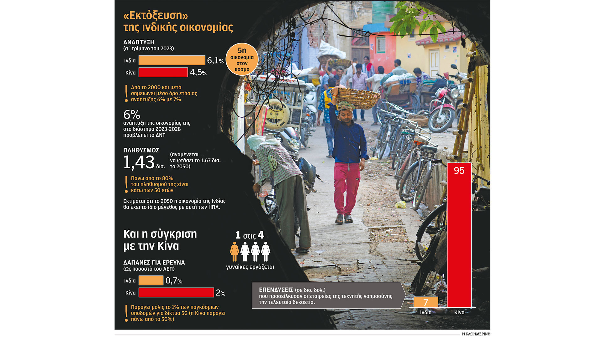 Βρέθηκε στο επίκεντρο του ενδιαφέροντος μέσα στην εβδομάδα, όταν το διαστημόπλοιό της προσσεληνώθηκε επιτυχώς κοντά στον νότιο πόλο της Σελήνης. Ετσι, εδώ και λίγες ημέρες η Ινδία είναι η τέταρτη χώρα στον κόσμο που το έχει επιτύχει μαζί με τις νυν και πρώην υπερδυνάμεις, τις ΗΠΑ, την πρώην Σοβιετική Ενωση και την Κίνα. Το επίτευγμα έδωσε το αίσθημα της υπερηφάνειας στον λαό της Ινδίας χάρη στην κλίμακα της προβολής που του δόθηκε. Ωστόσο, η ασιατική χώρα αποτελεί εδώ και χρόνια την ανερχόμενη δύναμη, αν και όχι και μελλοντική υπερδύναμη, του 21ου αιώνα που σημειώνει άλματα σε πολλά επίπεδα. Από τις αρχές του αιώνα, η Ινδία αναπτύσσεται με ρυθμούς εντυπωσιακούς για τα δυτικά δεδομένα, καθώς η οικονομία της αυξάνεται από 6% έως 7% ετησίως. Το ΔΝΤ προεξοφλεί, μάλιστα, ότι θα συνεχίσει με αυτούς τους ρυθμούς για τουλάχιστον μία πενταετία ακόμη, ενώ όλες οι προβλέψεις συγκλίνουν στην εκτίμηση πως το 2050 η οικονομία της Ινδίας θα έχει το ίδιο μέγεθος με αυτή των ΗΠΑ.