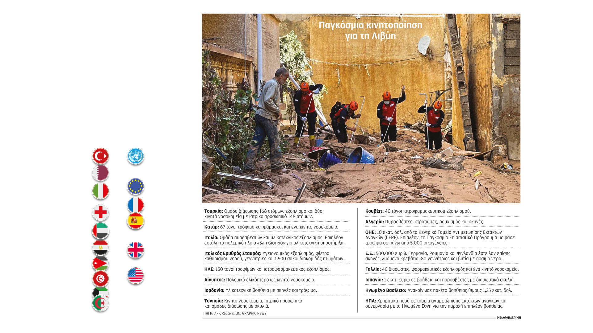 Ομως, παρά τον διχασμό, η κυβέρνηση της Τρίπολης έστειλε ένα αεροπλάνο με 14 τόνους ιατρικού υλικού, σάκους για πτώματα και περισσότερους από 80 γιατρούς και παραϊατρικό προσωπικό στα ανατολικά. Παράλληλα, ο «πολέμαρχος» στρατηγός Χαλίφα Χαφτάρ διέταξε τις ένοπλες δυνάμεις της δυτικής κυβέρνησης να κινητοποιηθούν προς ανακούφιση των πληγέντων στα ανατολικά. Διεθνείς παρατηρητές αναρωτιούνται αν αυτή η μορφή συνεργασίας θα μπορούσε να ωθήσει τους πολιτικούς να παραμερίσουν τις διαφορές τους και να σχηματίσουν και πάλι μια ενιαία κυβέρνηση.