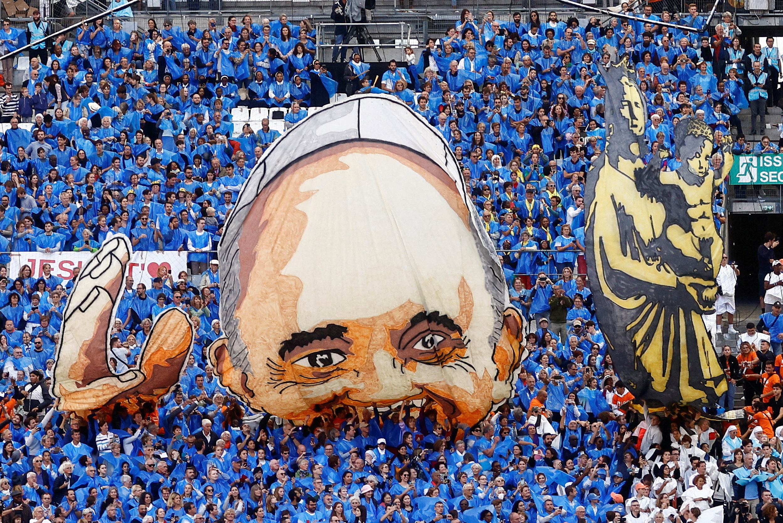 Κατά την άφιξή του, ένα τεράστιο «κορεό» ξεδιπλώθηκε από τους οπαδούς της Ολιμπίκ Μαρσέιγ, που απεικόνιζε την προτομή του Ποντίφικα δίπλα στην «Καλή Μητέρα» όπως αποκαλείται η Βασιλική Νοτρ-Νταμ-Ντε-Λα-Γκαρντ, η εκκλησία της Παναγίας προστάτιδας της πόλης. Πίσω από αυτό το πανό, που ξεδιπλωνόταν από την οροφή της νότιας πλευράς, οι χιλιάδες θεατές σχεδίασαν με χαρτόνια πρώτα έναν μπλε σταυρό σε λευκό φόντο, τη σημαία της Μασσαλίας, προτού γράψουν εκεί ένα τεράστιο «Ευχαριστώ» με κίτρινα γράμματα που σχηματιζόταν από χρυσά χαρτιά.