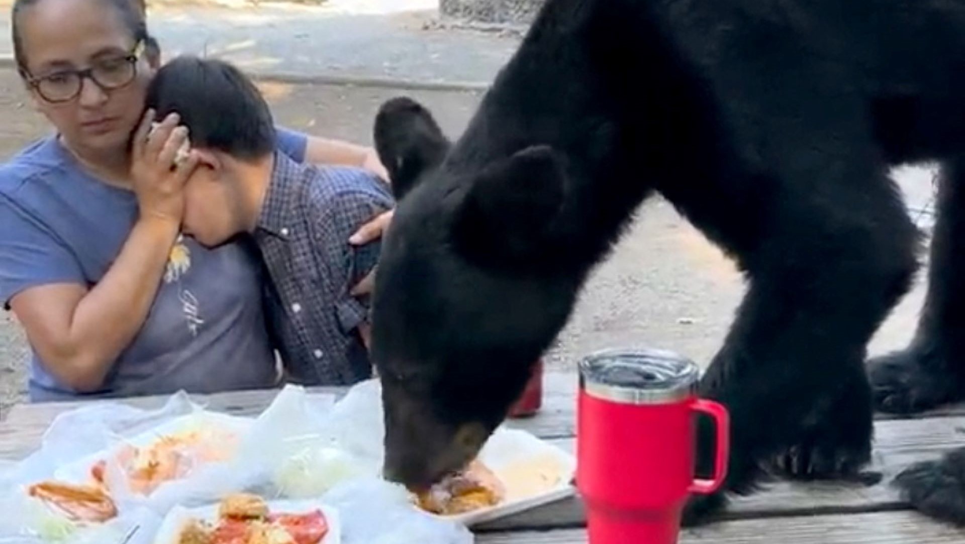 Μόλις έκατσαν για το γεύμα τους, η αρκούδα εμφανίστηκε, ανεβαίνοντας στον ξύλινο πάγκο και αρχίζοντας να καταβροχθίζει πατάτες, εντσιλάδας, τάκος και σάλσα που ήταν απλωμένα μπροστά της.