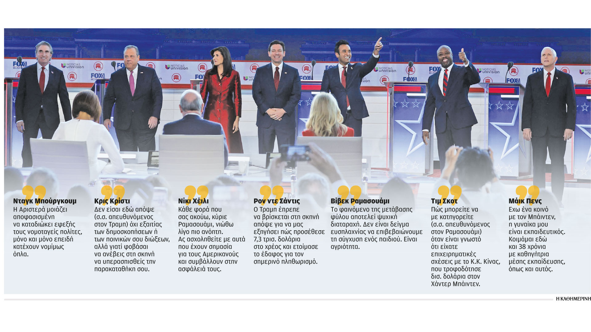 ΛΟΣ ΑΝΤΖΕΛΕΣ. Χωρίς το φαβορί για το χρίσμα των Ρεπουμπλικανών, Ντόναλντ Τραμπ, διεξήχθη χθες το δεύτερο τηλεοπτικό ντιμπέιτ μεταξύ των επτά υποψηφίων του κόμματος στην προεδρική βιβλιοθήκη Ρέιγκαν στη Σίμι Βάλεϊ, βορείως του Λος Αντζελες. Την ώρα που οι επτά αντίπαλοι συγκρούονταν στην εξέδρα, ο Τραμπ εκφωνούσε ομιλία στο Μίσιγκαν, όπου τα συνδικάτα της αυτοκινητοβιομηχανίας συνεχίζουν την απεργία τους με αίτημα βελτιωμένες συνθήκες εργασίας και μισθολογικές αυξήσεις.