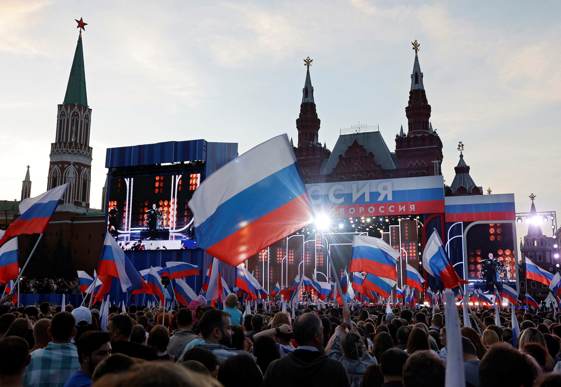 Χιλιάδες άνθρωποι συγκεντρώθηκαν σήμερα στην Κόκκινη Πλατεία στη Μόσχα, για να γιορτάσουν την πρώτη επέτειο από την προσάρτηση τεσσάρων περιοχών της Ουκρανίας, με φόντο συνθήματα όπως ήταν τα «ένα έθνος, μία οικογένεια, μία Ρωσία» και «το Ντονμπάς είναι η Νέα Ρωσία».