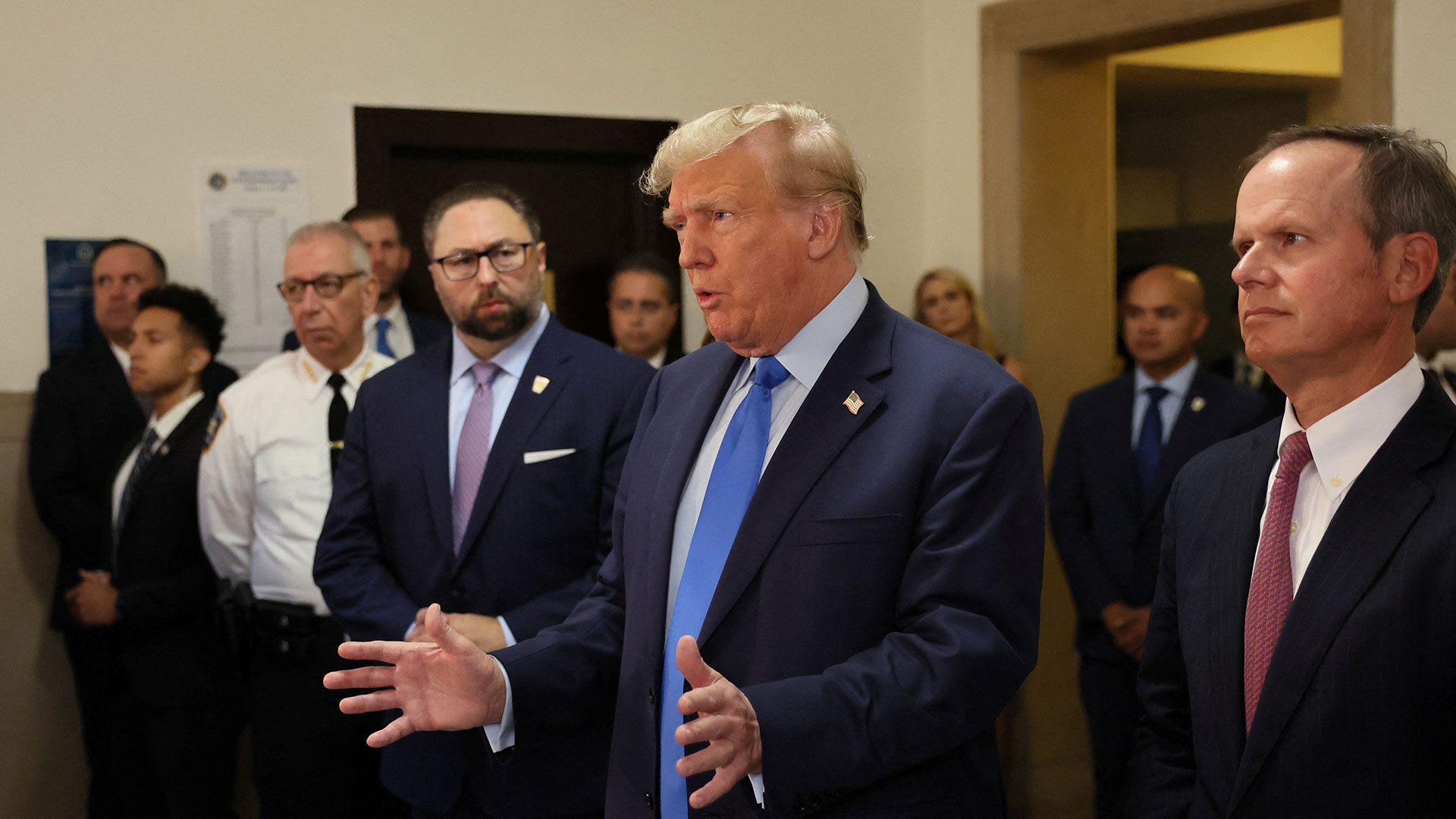 Οι αστυνομικές αρχές είχαν τοποθετήσει οδοφράγματα, καθώς διαδηλωτές συγκεντρώθηκαν έξω από το δικαστήριο, ζητώντας τη φυλάκιση του πρώην προέδρου των ΗΠΑ.