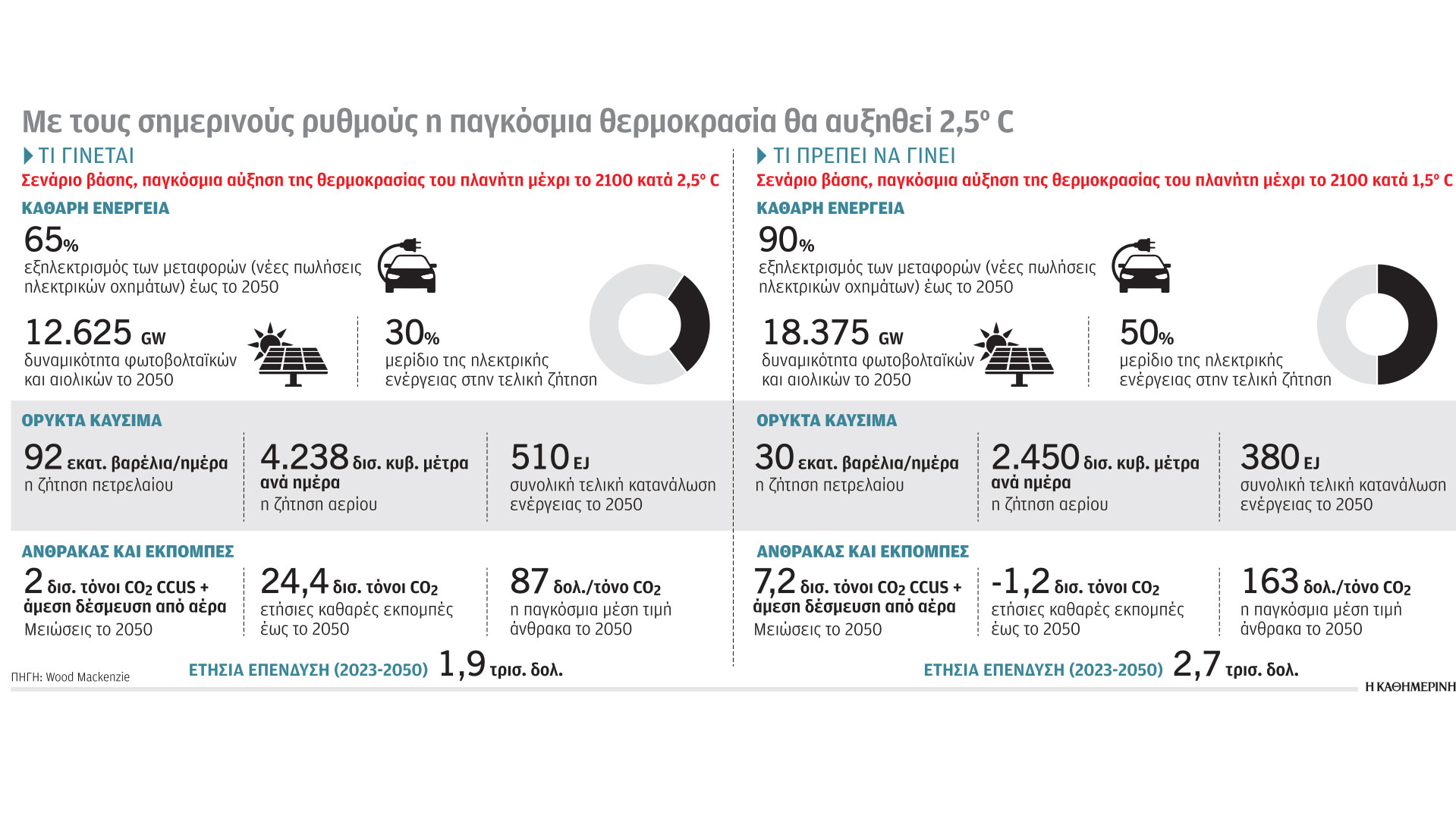 Μέσα σε δύο γραφήματα όλο το πρόβλημα… Σύμφωνα με τη Wood Mackenzie, οι παγκόσμιοι στόχοι για το 2050, για αύξηση θερμοκρασίας στο τέλος του αιώνα έως 1,5° C (έναντι του βασικού σεναρίου που στηρίζεται στον σημερινό ρυθμό, με βάση το οποίο προβλέπεται αύξηση στους 2,5° C), είναι: