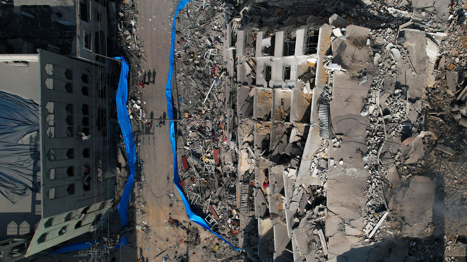 - 17:11Εικόνα από τα ερείπια ενός κτιρίου έπειτα από ισραηλινή αεροπορική επιδρομή στην πόλη της Γάζας