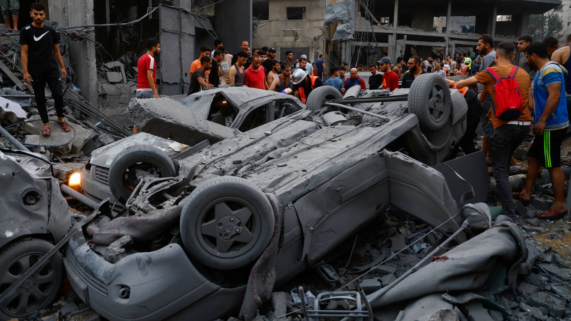 - 16:59Παλαιστίνιοι γύρω από τα ερείπια ενός κτιρίου που καταστράφηκε στα ισραηλινά πλήγματα στη Λωρίδα της Γάζας