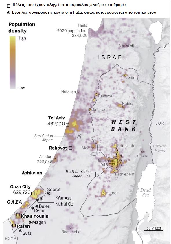 Εναέριες επιδρομές και επιθέσεις με πυραύλους έχουν πλήξει μεγάλες πόλεις στο Ισραήλ και τη Γάζα, μεταξύ των οποίων και η Πόλη της Γάζας, με εκτιμώμενο πληθυσμό περίπου 630.000 κατοίκους, αλλά και το Τελ Αβίβ, με περίπου 460.000 κατοίκους.