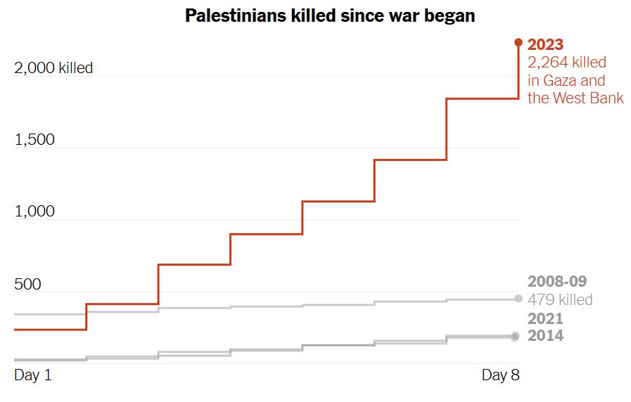 Προτού ακόμα τα ισραηλινά στρατεύματα ξεκινήσουν οποιαδήποτε χερσαία εισβολή, μια σύγκριση με τον απολογισμό των προηγούμενων συγκρούσεων δείχνει την τεράστια κλίμακα της αεροπορικής επίθεσης του Ισραήλ στη Λωρίδα της Γάζας. Πολύ περισσότεροι Παλαιστίνιοι έχουν σκοτωθεί τις τελευταίες οκτώ ημέρες από τις επιθέσεις σε σχέση με τις πρώτες ημέρες άλλων συγκρούσεων.