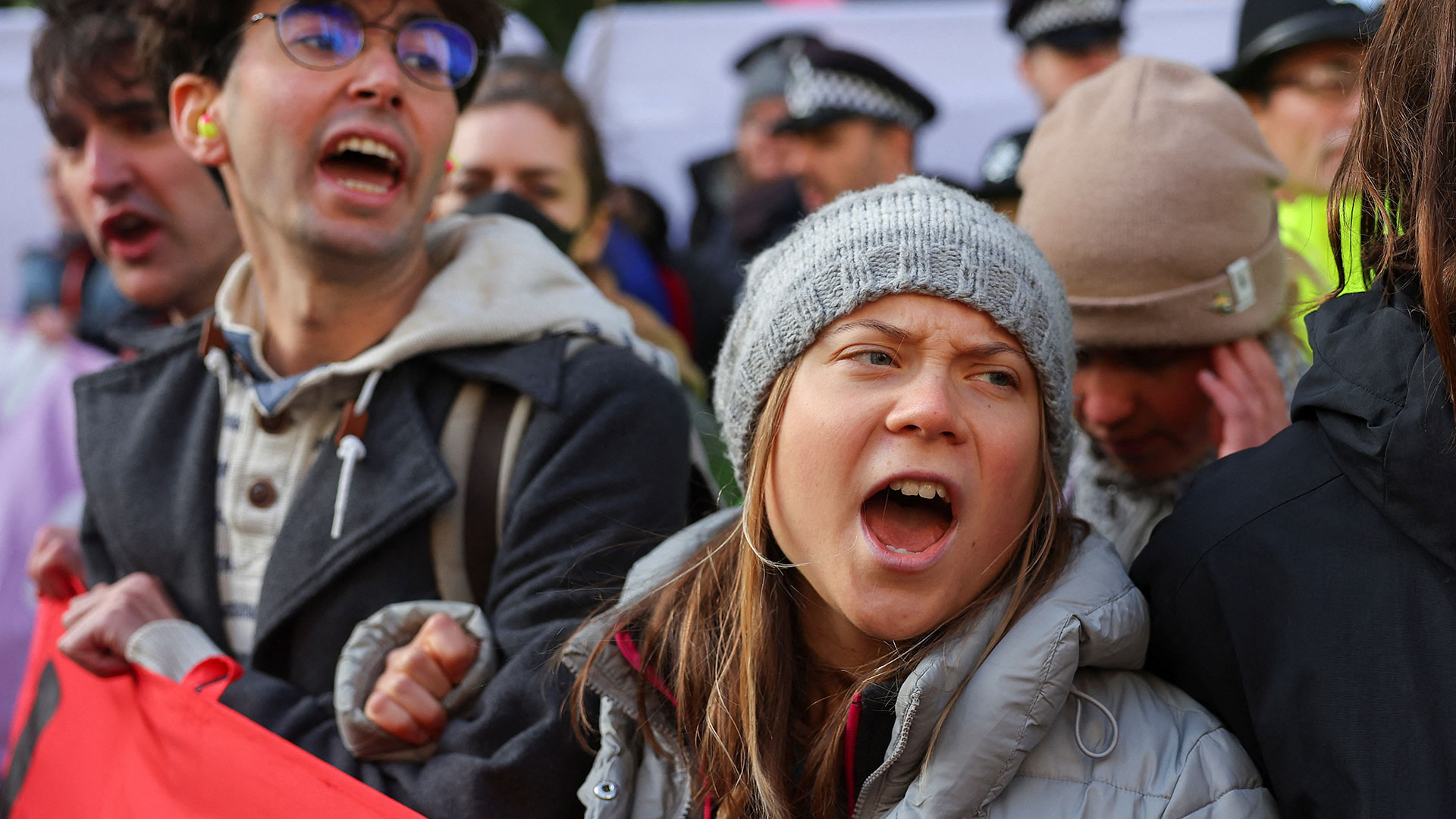 Σε βίντεο και φωτογραφίες από το σημείο, η Τούνμπεργκ φαίνεται να στέκεται ήρεμη ανάμεσα σε δύο αστυνομικούς. Νωρίτερα, η αστυνομία είχε ανακοινώσει στην πλατφόρμα X τη σύλληψη πέντε διαδηλωτών για παρακώλυση της κυκλοφορίας.