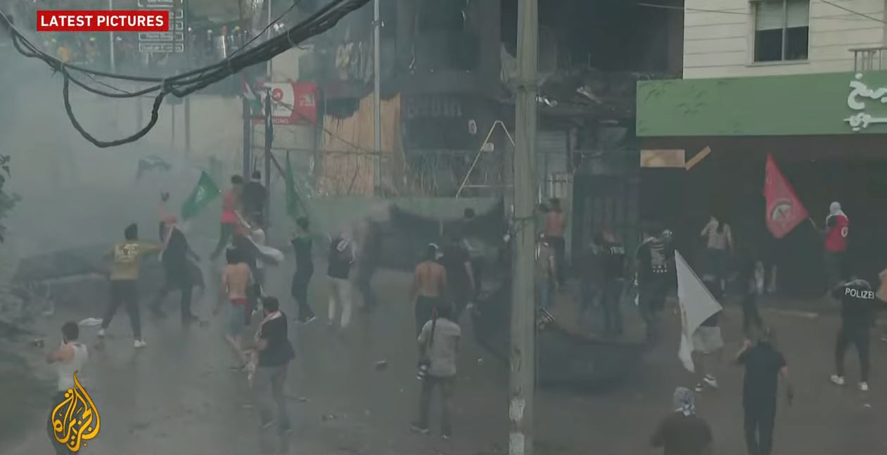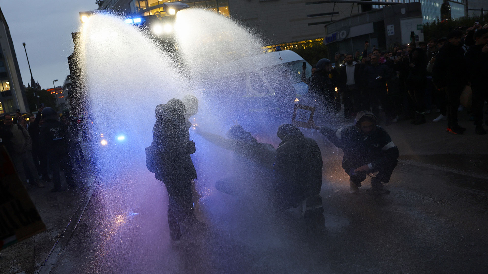 - 19:25Ανθρωποι καταβρέχονται από κανόνι νερού κατά τη διάρκεια διαδήλωσης υπέρ των Παλαιστινίων στη Φρανκφούρτη