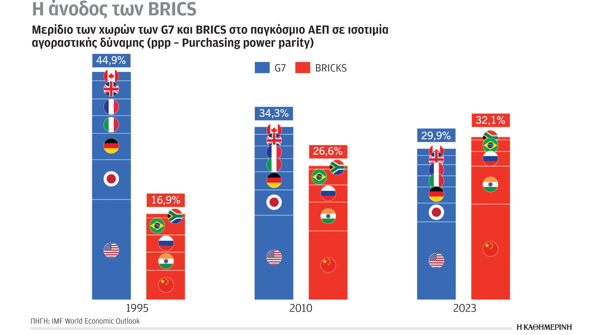 Καταγράφεται πληθυσμιακή έκρηξη με υψηλά ποσοστά νεανικού πληθυσμού στην Ανατολή, σε αντίθεση με την πληθυσμιακή συρρίκνωση στη Δύση. Η συνεισφορά του G7 στο παγκόσμιο ΑΕΠ μειώνεται από 45% το 1995 σε 30% το 2023. Αντίθετα, η συνεισφορά των BRICS εκτοξεύεται από 17% το 1995 σε 32% το 2023, ξεπερνώντας κατά δύο μονάδες το αντίστοιχο ποσοστό του G7. Σημαντικό ρόλο έπαιξε η οικονομική άνοδος Κίνας και Ινδίας. Από αρχές 2024, στους BRICS προστίθενται Αργεντινή, Αίγυπτος, Ιράν, Αιθιοπία, Σαουδική Αραβία, Ηνωμένα Αραβικά Εμιράτα.