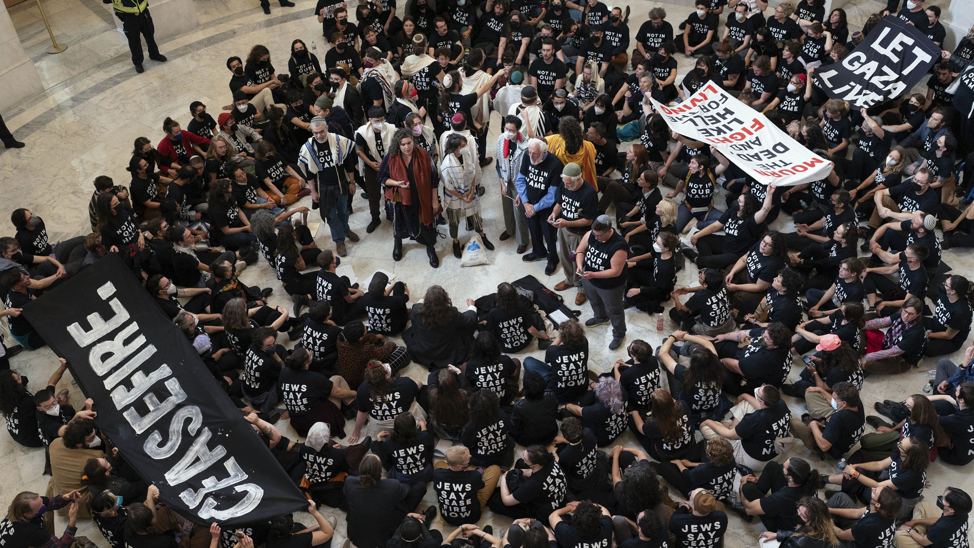 Τη διαδήλωση κάλεσαν δύο οργανώσεις προοδευτικών Εβραίων των ΗΠΑ, η Jewish Voice for Peace και η IfNotNow. Περίπου 400 μέλη τους εισήλθαν στη ροτόντα του Cannon House Office Building, του παλαιότερου κτιρίου του Κογκρέσου στην Ουάσιγκτον. Σύμφωνα με τους New York Times, 25 ραββίνοι διάβασαν μαρτυρίες Παλαιστινίων από τη Λωρίδα της Γάζας και προσευχήθηκαν για όλα τα θύματα της βίας. Εξω από το κτίριο εκατοντάδες συγκεντρωμένοι φώναζαν «ανακωχή τώρα» στα εβραϊκά και στα αγγλικά, ζητώντας από την κυβέρνηση και το Κογκρέσο να πιέσουν ώστε οι δύο αντίπαλες πλευρές να έρθουν σε ειρηνευτική συμφωνία. Οι περισσότεροι από τους διαδηλωτές εντός του κτιρίου φορούσαν μαύρα μπλουζάκια που έγραφαν «Οι Εβραίοι λένε κατάπαυση του πυρός τώρα» και «Οχι στο όνομά μας». Αλλοι κρατούσαν πανό που έγραφαν «ειρήνη» και τραγουδούσαν καθισμένοι στο πάτωμα της ροτόντας. «Προειδοποιήσαμε τους διαδηλωτές να αποχωρήσουν από το μέρος και, όταν εκείνοι δεν συμμορφώθηκαν, αρχίσαμε να τους συλλαμβάνουμε», δήλωσε εκπρόσωπος της αστυνομίας του Καπιτωλίου.