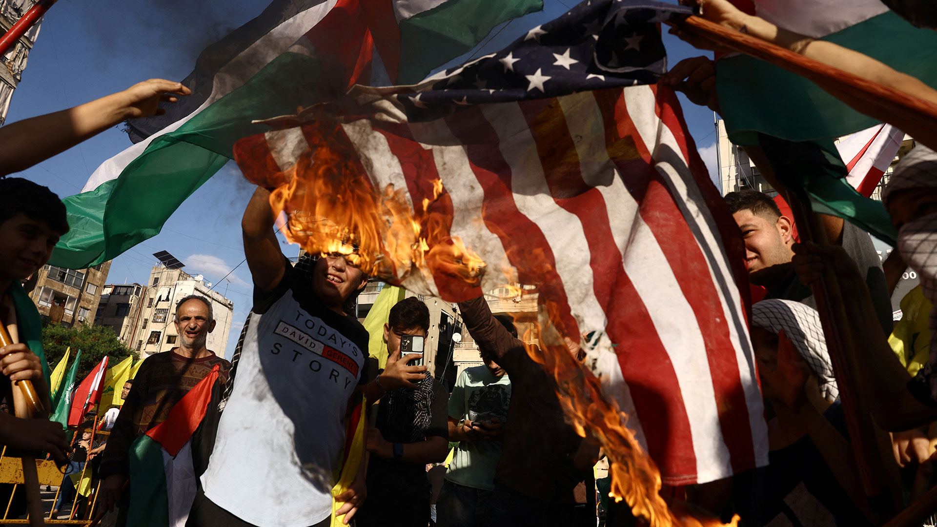 - 17:05Διαδηλωτές καίνε μια σημαία των ΗΠΑ στη Βηρυτό